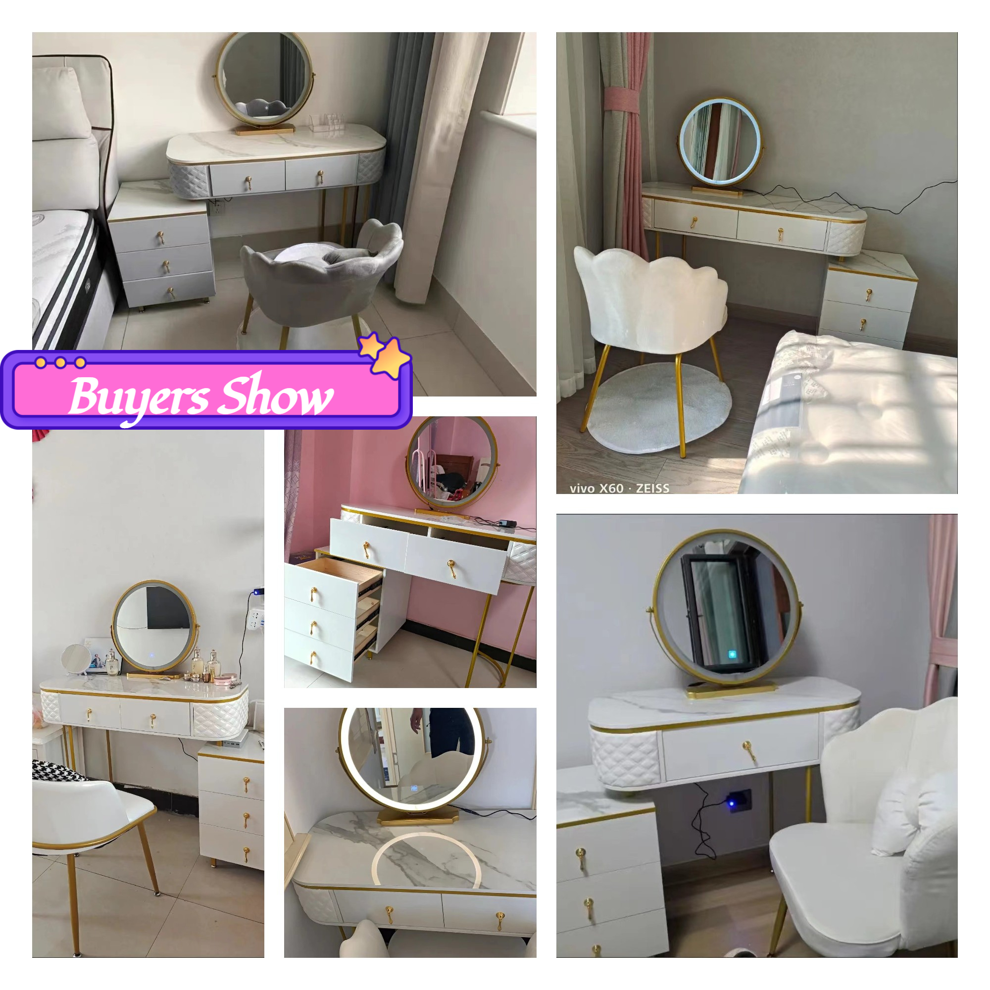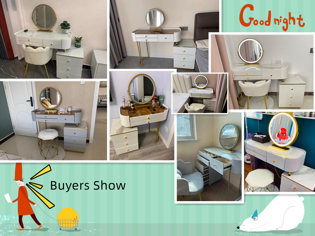 3. The dressing table with metal feet, the exquisite and unique design brings a fresh experience to your room. The table legs and mirror frames have a golden painted frame, which has a luxurious texture and provides strong support.