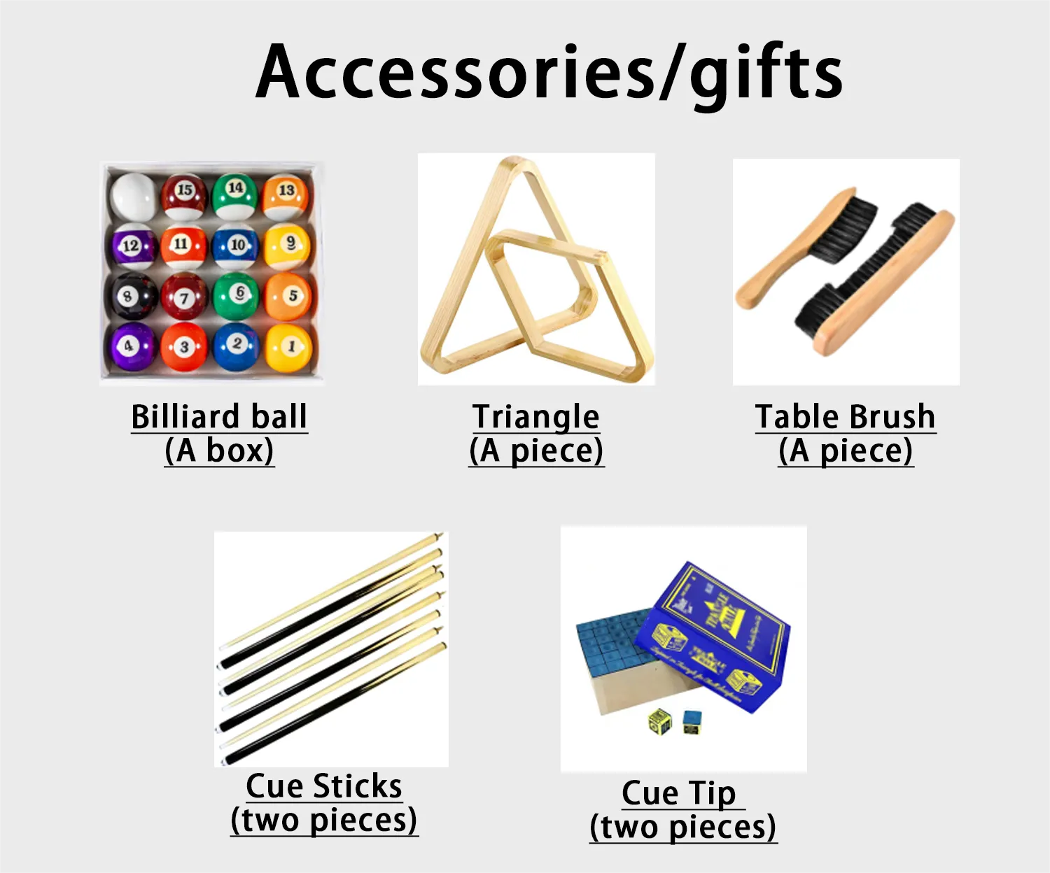 • Game equipment includes: 2 x 57 inch cues, triangles, chalk, brushes and billiard set. Assembled dimensions: 84. 5" L x 50" W x 31" H / 290 lbs. Playing field dimensions:
