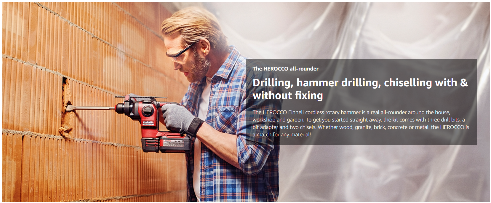 • 4 in 1 - The HEROCCO cordless rotary hammer combines four functions in one device. It can drill, hammer drill and chisel with and without fixing