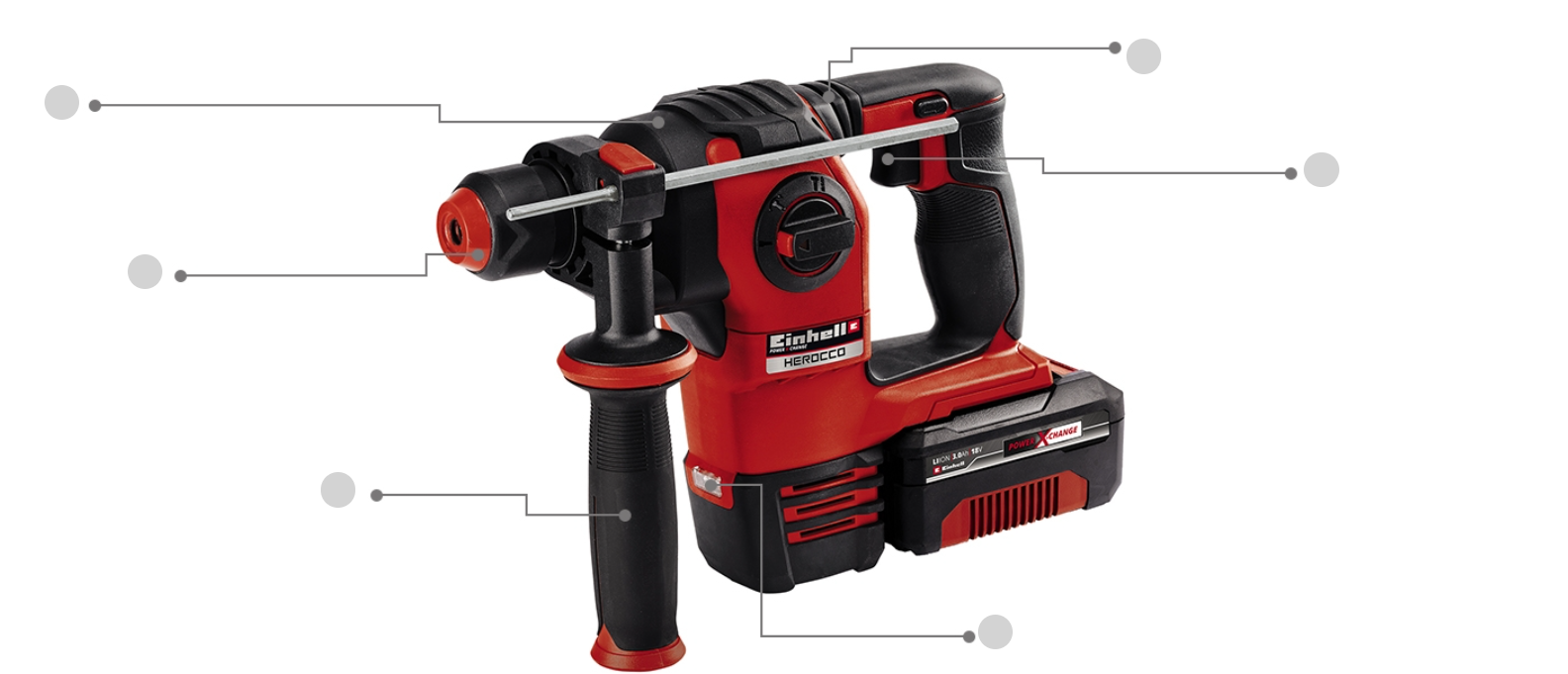 • Included in delivery - The cordless rotary hammer comes with a 3.0 Ah Power X-Change battery and charging device in an Einhell box with bit adapter, 3 drill bits, a flat chisel and a pointed chisel